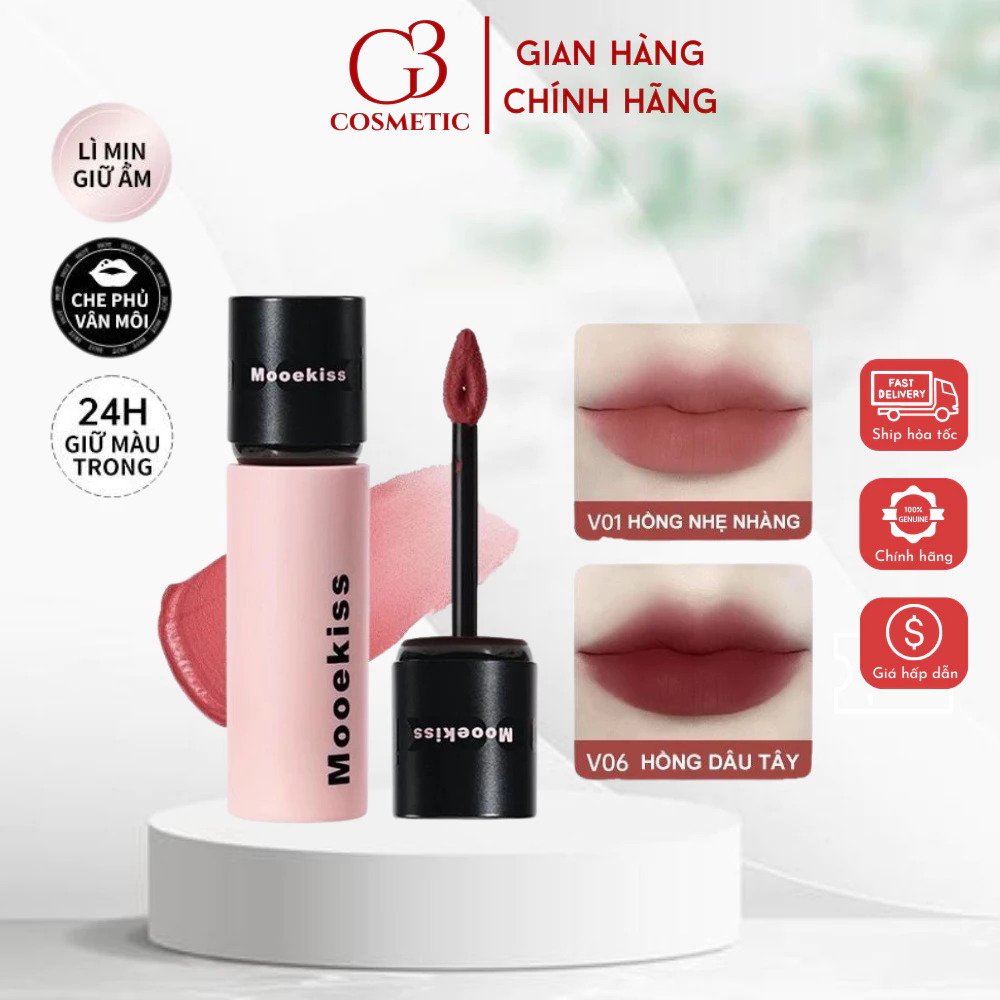 - Son kem bùn MOOEKISS Velvet Lip Mud tint lì 3g mềm mịn lâu trôi không khô môi bản vỏ hồng đen G3COSMETICS: Sản phẩm này có công thức mềm mại, khả năng bám màu lâu và không bị khô môi.